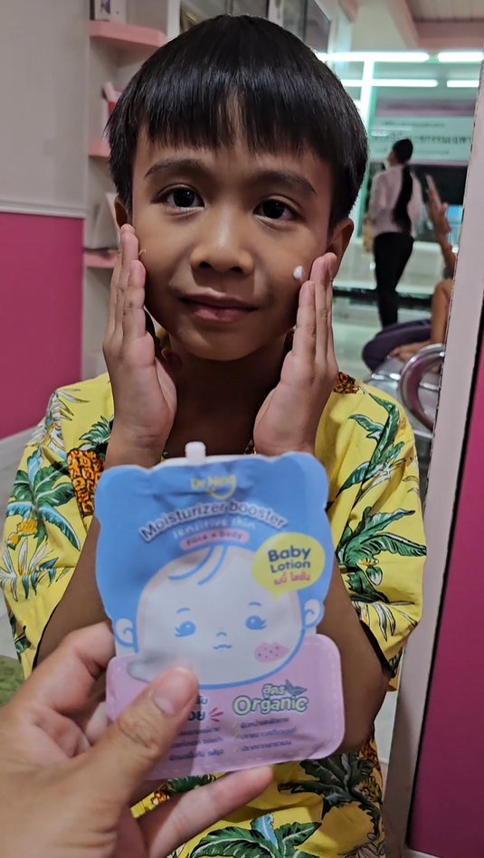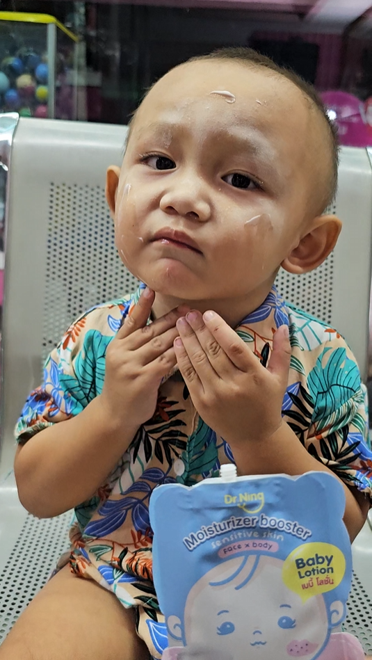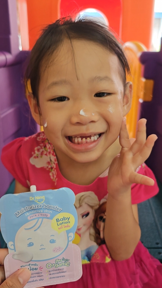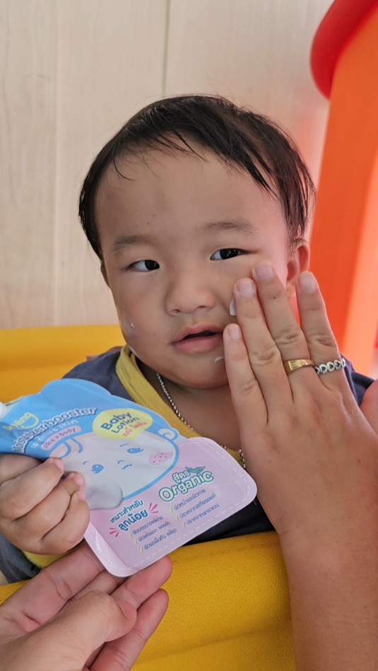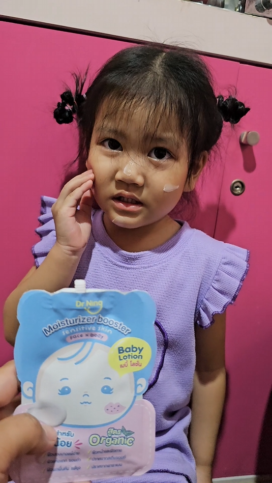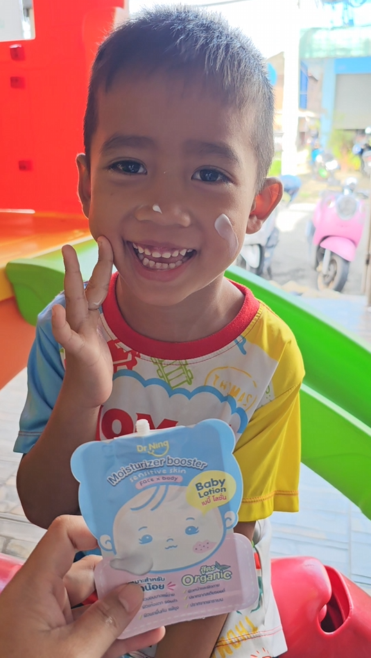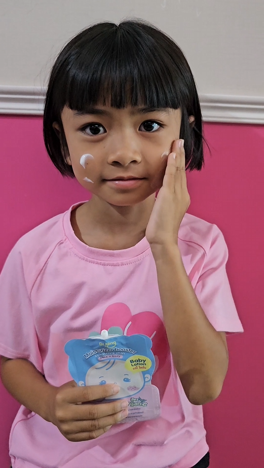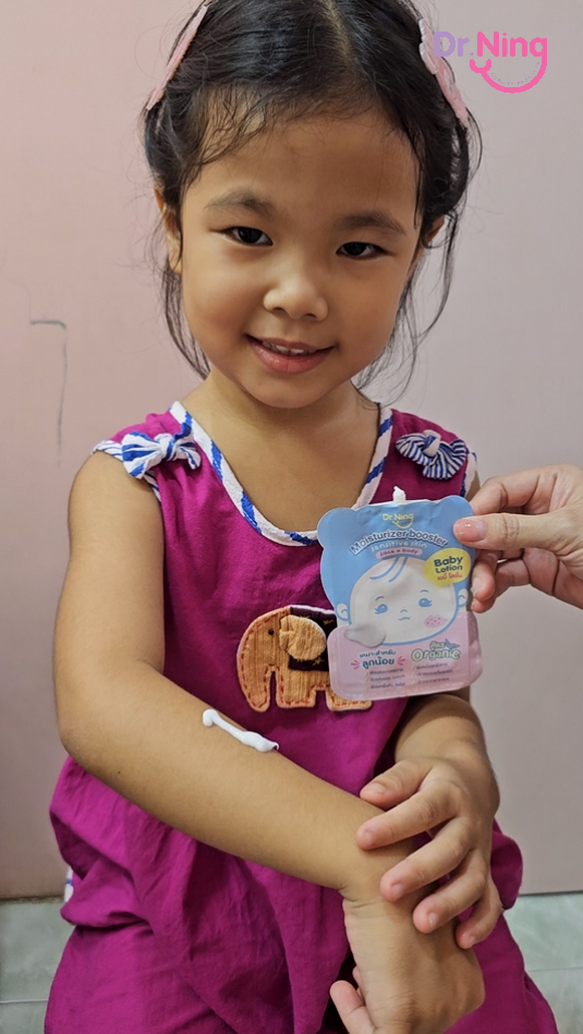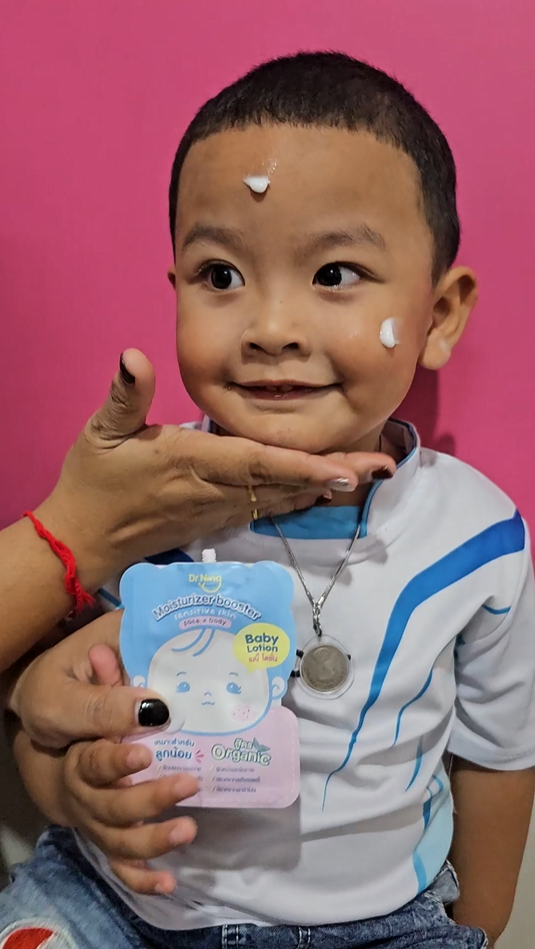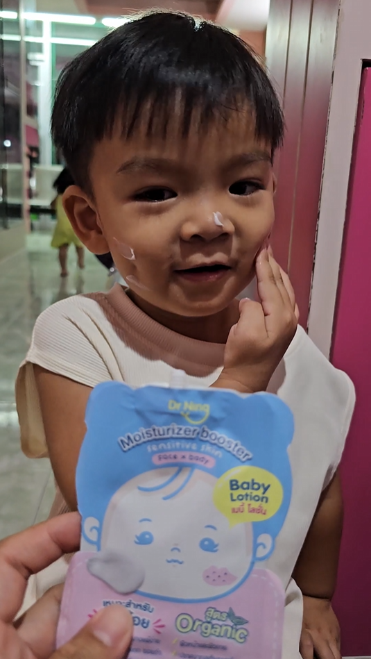 "หลังจากที่ได้ทาแล้วผิวของน้องนุ่มขึ้น ชุ่มชื้นขึ้นมาก เนื้อครีมทาง่ายนุ่มลื่นเวลาสัมผัส"
